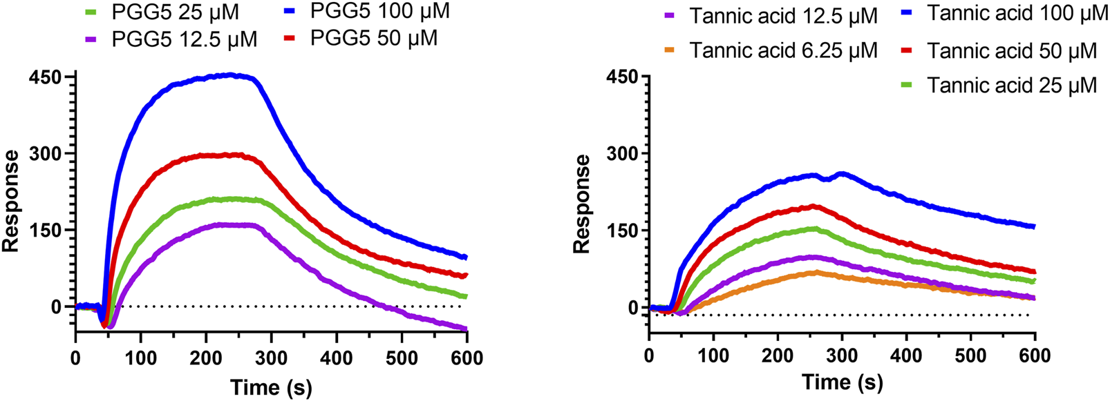 From the extract of Paeoniae Radix Rubra, we successfully identified PGG as a potent inhibitor of hQC, with its derivatives, tannic acid, exhibiting comparable inhibitory efficacy. To further substantiate the binding between these inhibitors and hQC, localized surface plasmon resonance (LSPR) experiments were performed. PGG was tested at concentrations of 12.5, 25, 50, and 100 μM during the LSPR analysis (Figure 9). The sensorgrams revealed a binding profile characterized by a slow association phase followed by rapid dissociation, indicative of a transient interaction between PGG and hQC. This interaction yielded a dissociation constant (KD) of 63.7 ± 0.1 nM (Figure 9). Similarly, the binding of tannic acid to hQC was evaluated at concentrations of 6.25, 12.5, 25, 50, and 100 μM (Figure 9). Although the binding signals for tannic acid were slightly weaker compared to PGG, the sensorgrams displayed a similar kinetic profile, with slow association and rapid dissociation, suggesting analogous binding behavior between tannic acid and hQC. Consequently, the KD value of tannic acid to hQC was determined to be 22.8 ± 0.1 nM.