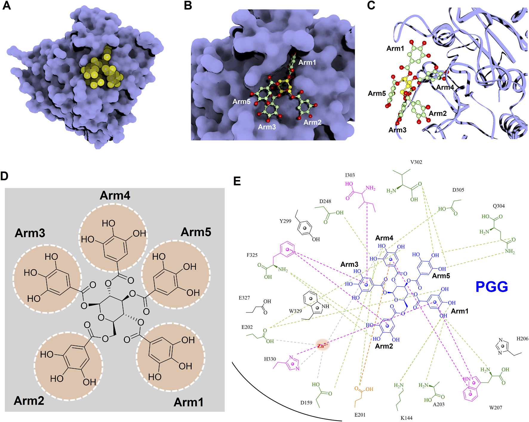 Detailed molecular interactions between PGG and human glutaminyl cyclase (hQC) revealed by molecular docking and MD simulations. (A) Surface representation of hQC (purple) with PGG shown as yellow spheres, illustrating the overall binding site. (B) Magnified view of the hQC–PGG interface with PGG in ball-and-stick representation and hQC in surface mode, highlighting key contact regions. (C) PGG displayed as ball-and-stick and hQC as a ribbon structure (purple) to show the spatial orientation of the binding pocket and ligand accommodation. (D) Chemical structure of PGG, depicting its pentagalloylglucose scaffold. (E) 2D interaction diagram between PGG and hQC, where green dashed lines indicate hydrogen bonds, magenta dashed lines represent hydrophobic contacts, orange dashed lines show anion–π interactions, and gray dashed lines denote coordination with the catalytic zinc ion. These analyses identify critical residues involved in PGG binding and provide insight into its inhibitory mechanism against hQC.