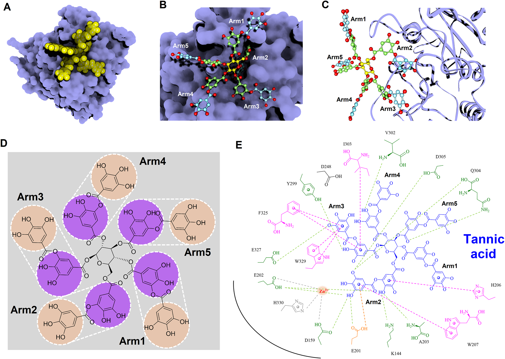 Detailed molecular interactions between tannic acid and human glutaminyl cyclase (hQC) revealed by molecular docking and MD simulations. (A) Surface representation of hQC (purple) with tannic acid shown as yellow spheres, illustrating the overall binding site. (B) Magnified view of the hQC–tannic acid interface with tannic acid in ball-and-stick representation and hQC in surface mode, highlighting key contact regions. (C) Tannic acid displayed as ball-and-stick and hQC as a ribbon structure (purple) to show the spatial orientation of the binding pocket and ligand accommodation. (D) Chemical structure of tannic acid, depicting its polyphenolic scaffold. (E) 2D interaction diagram between tannic acid and hQC, where green dashed lines indicate hydrogen bonds, magenta dashed lines represent hydrophobic contacts, orange dashed lines show anion–π interactions, and gray dashed lines denote coordination with the catalytic zinc ion. These analyses identify critical residues involved in tannic acid binding and provide insight into its inhibitory mechanism against hQC.