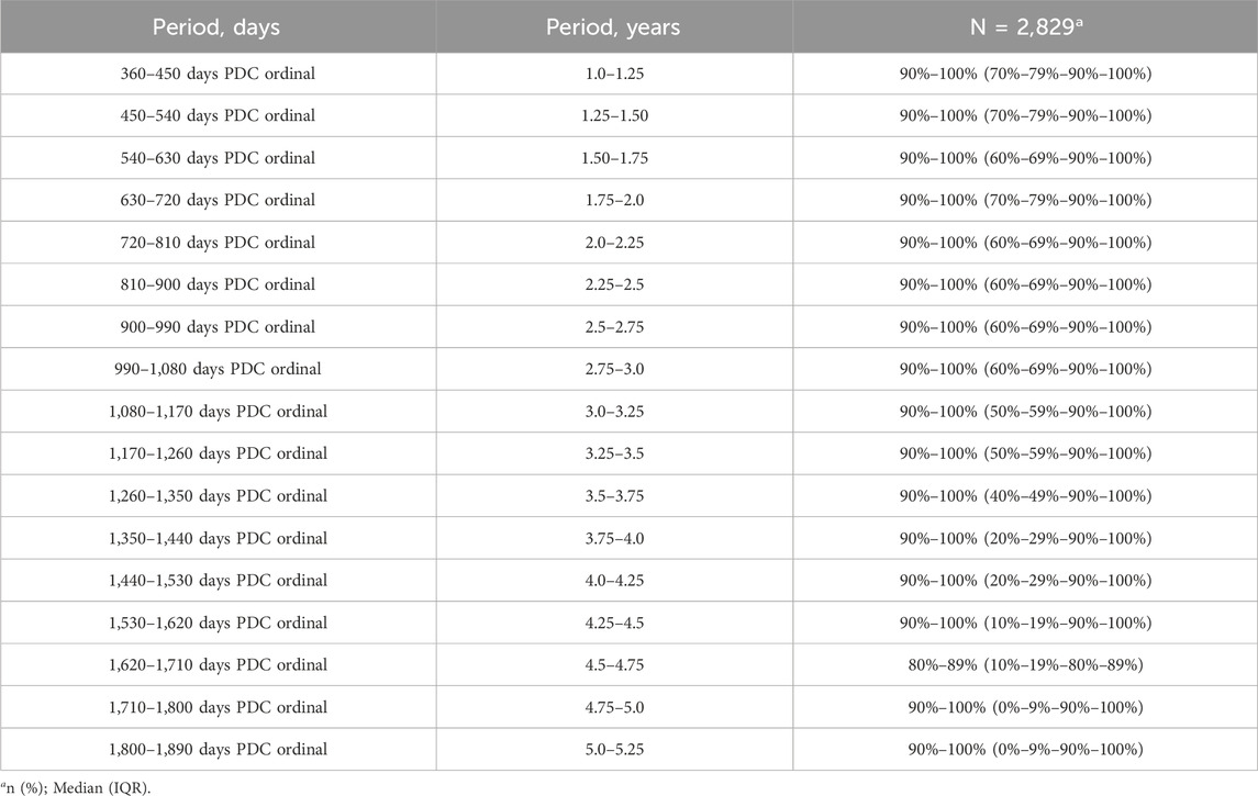 Overall, the median PDC state was high, 90%–100%, in all 90-day windows from year two to year 5 (see Table 3). However, the interquartile range changed from PDC 70–79%-90%–100% in the first 90-day windows of year two to 0–9%-90%–100% in the last 90-day windows of year 5, indicating that overall there was a decline in PDC state over time. Table 3 presents PDC states across all 90-day windows from years two–5. About two-thirds of patients were prescribed Apixaban, followed by Rivaroxaban and dabigatran. 11.7% of patients switched between DOAC agents (Supplementary Table S2; Supplementary Material). PDC variation by DOAC agent is presented in table (Supplementary Table S3; Supplementary Material).