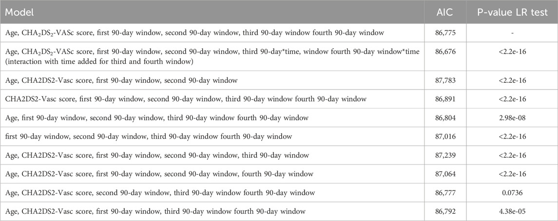 The basic model was compared to a model with a basic model with interaction with time for the third and fourth window adherence data, a model with only the first two 90-day windows adherence data (i.e., data from the first half of the first year), a basic model in addition to age and CHA2DS2-VASc score, a basic model and age alone, and a basic model and CHA2DS2-VASc score alone. Models were compared based on the Akaike Information Criteria (AIC) and the likelihood ratio (LR) test.