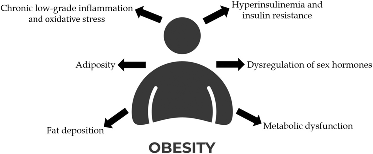 Notably, obesity is implicated in approximately 20% of all cancer cases, contributing to cancer development through several interconnected mechanisms, such as hyperinsulinemia and insulin resistance, dysregulation of sex hormones, chronic low-grade inflammation and oxidative stress, increased adiposity, the impact of ectopic fat deposition and metabolic dysfunction (Avgerinos et al., 2019; Karra et al., 2022; Wolin et al., 2010) (Figure 2).