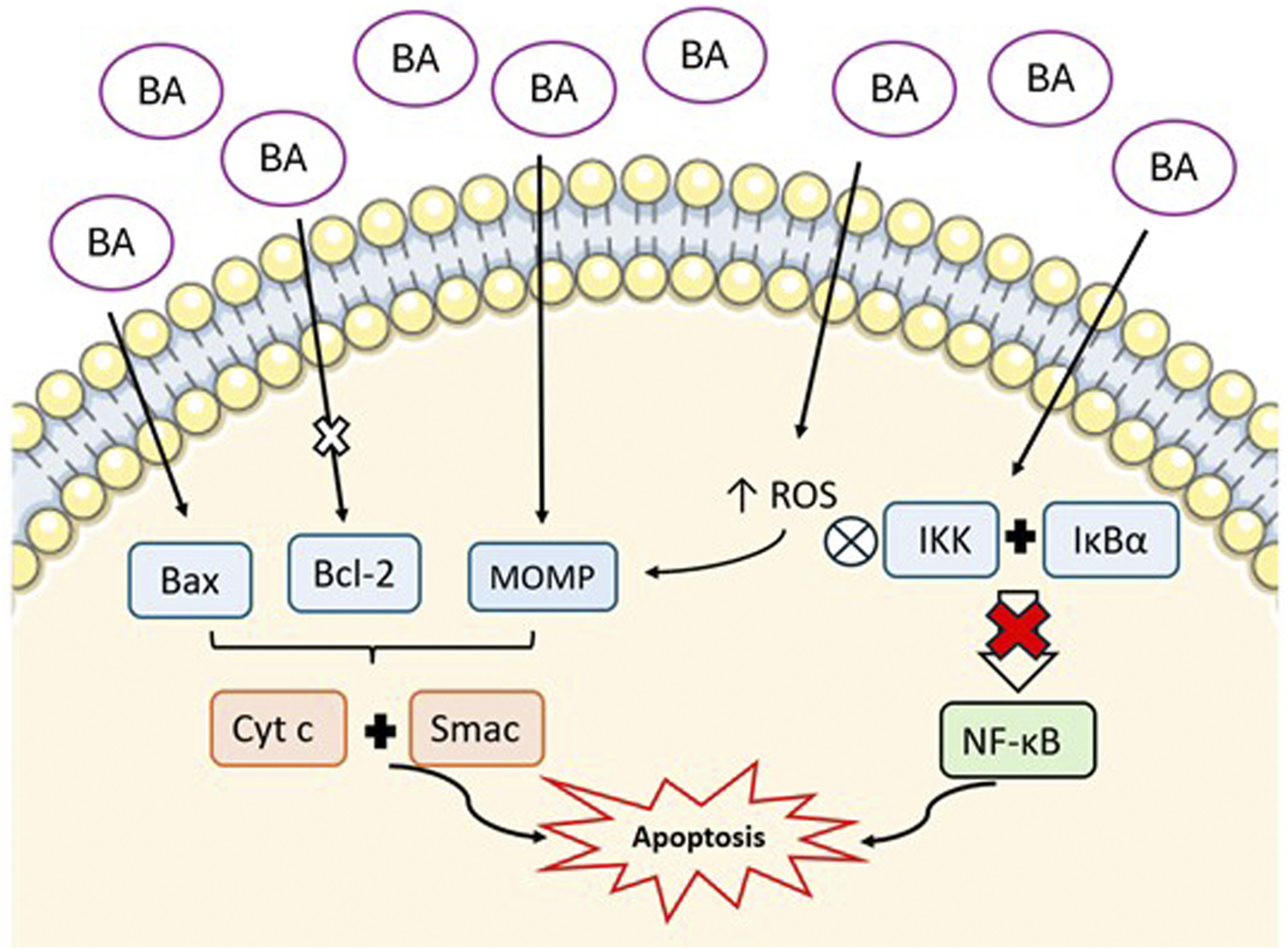 Representation of the mechanism of BA-induced apoptosis via mitochondrial pathway. BA increases pro-apoptotic proteins (Bax), inhibits anti-apoptotic proteins (Bcl-2), and promotes mitochondrial outer membrane permeabilization (MOMP). This results in the release of cytochrome c (Cyt c) and Smac into the cytosol. Additionally, BA increases reactive oxygen species (ROS) and inhibits NF-κB pathway by supressing IKK complex and IκBα. All these mechanisms culminate in the promotion of apoptosis. (Image created with an icon fromsmart.servier.com).