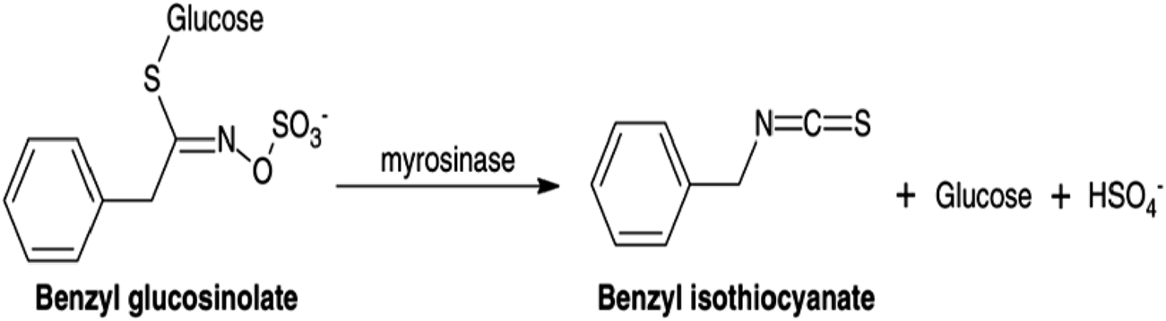 Schematic representation of the enzymatic conversion of benzyl glucosinolate into benzyl isothiocyanate (BITC) catalyzed by myrosinase.