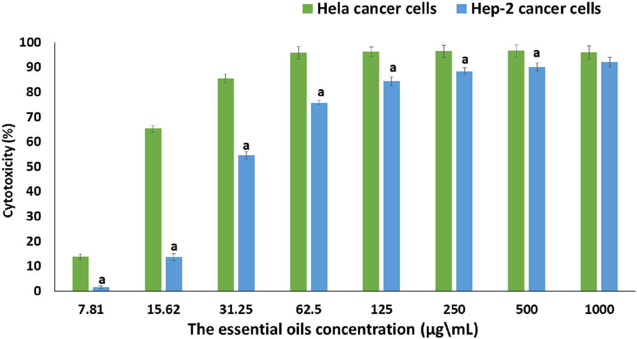 Cell cytotoxicity (cell viability) was detected by [3-(4,5-dimethylthiozol-2-yL)-2,5-diphenyl tetrazolium bromide] (MTT) assay (Moussa et al., 2025b; 2025a; Mustafa et al., 2025). The MTT assay is a colorimetric method used to determine the metabolically viable percentage of Hep-2 and HeLa cancer cells after treatment with the extracted essential oil from C. papaya seeds, as previously described (Hanna et al., 2023). In a nutshell, the 96-well tissue culture plate was incubated with 100 µL of cells (1 × 105) per well and incubated for 24 h at 37 °C that is, mainly to develop a complete monolayer sheet. Then, the cells were treated with different concentrations (7.81, 15.62, 31.25, 62.5, 125, 250, 500, and 1,000 µg/mL) of the extracted essential oil at 37 °C for an overnight incubation period. Subsequently, checking for any visual toxicity signs, like cell rounding, granulation, shrinkage, and complete or partial monolayer distribution in both the treated and control cells. After that, the 20 µL of MTT solution (5 mg/mL in PBS) was used to treat untreated cells (control) and the essential oil-treated cells for 4 h at an incubation temperature of 37 °C, that is to allow the metabolism of MTT into formazan which is an insoluble dark purple products that is directly proportional to the viable cells’ numbers. The intracellular reduction of MTT to form the formazan depends mainly on the mitochondrial dehydrogenase enzyme. Then, 200 µL of DMSO (dimethyl sulfoxide) was added to each well with shaking for 5 min at 150 rpm; that is to extract the MTT metabolic product (formazan crystal). Finally, the optical density of the formazan crystal was recorded at 560 nm using a microplate reader (Bio-Rad, United States). The effect of the concentration of the extracted essential oil on the proliferation of HeLa and Hep-2 cancer cells was represented as the percentage of cytotoxicity using the following Equations 4, 5 (Praveena et al., 2017; Anilkumar and Bhanu, 2022; El-Atawy et al., 2024):