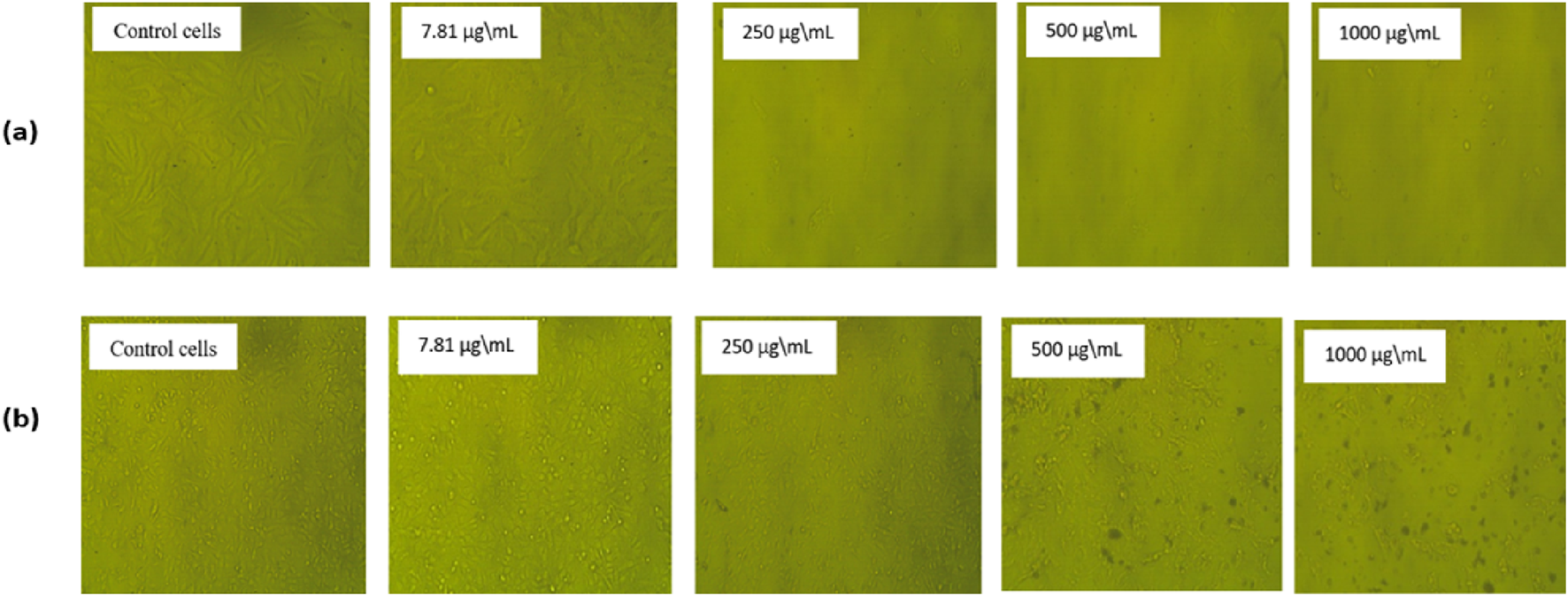 The Hep-2 cell line (Human Laryngeal Carcinoma) (CCL-23) and the HeLa cell line (Human Cervical Carcinoma) (CCL-2) were purchased from the VACSERA tissue culture unit in Egypt. The cell lines were grown in (DMEM) Dulbecco’s Modified Eagle’s Medium, augmented with (FBS) fetal bovine serum (10%) and supplemented with two antibiotics (penicillin (100 mg/mL) and streptomycin (100 mg/mL)). Then preserved in a humidified atmosphere with 5% CO2 at 37 °C. Finally, the cell lines were trypsinized utilizing trypsin EDTA, then subcultured in the culture flasks to keep them and used in the following experiments.