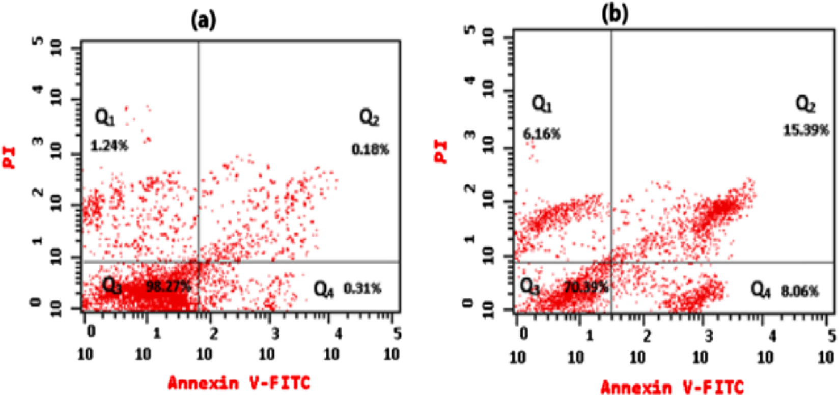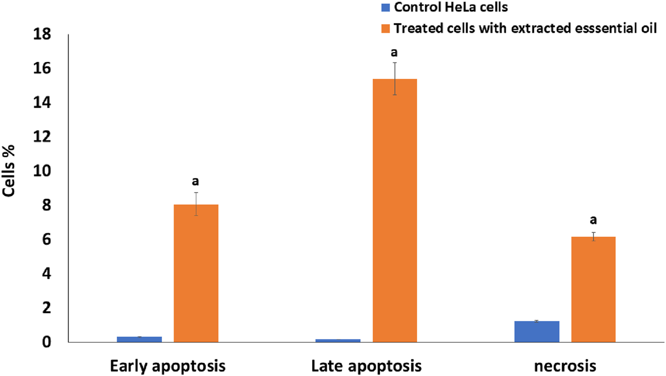 The Annexin V/PI assay can be used to discriminate between necrotic and apoptotic cells using both FITC Annexin V-fluorescein isothiocyanate and (PI) propidium iodide stains, depending on the ability of FITC to bind to the phosphatidyl serine (PS), which allows it to transfer to the outer cell membrane from the inner plasma membrane after the early apoptotic process. Also, the permeabilized membrane of the necrotic cells was identified by using PI. The percentage of apoptotic/necrotic cells in the treated HeLa cells that were previously treated for 24 h with an IC50 concentration of the extracted essential oil from C. papaya seeds and untreated HeLa cells was detected by an Annexin V-FITC kit (BD Bioscience) as previously reported (Ahmed et al., 2024; Mustafa et al., 2025). In a nutshell, in a 6-well culture plate, HeLa cancer cells were harvested and incubated overnight; that is, it allowed the cells to adhere and proliferate. Then, the HeLa cells were treated with the extracted essential oil for 24 h. Then, the treated and untreated HeLa cells were trypsinized, centrifuged, and then washed with cold phosphate buffer saline twice. After that, the washed cells were reacted with the Annexin V binding buffer, and then into a culture tube, 100 µL of this cell solution was transferred for 15 min in the dark, allowing the Annexin V-FITC to incubate with stained cells and identify the presence of necrotic cells and also early and late apoptotic cells by using a BD Biosciences, BD FACS CaliburTm flow cytometer.