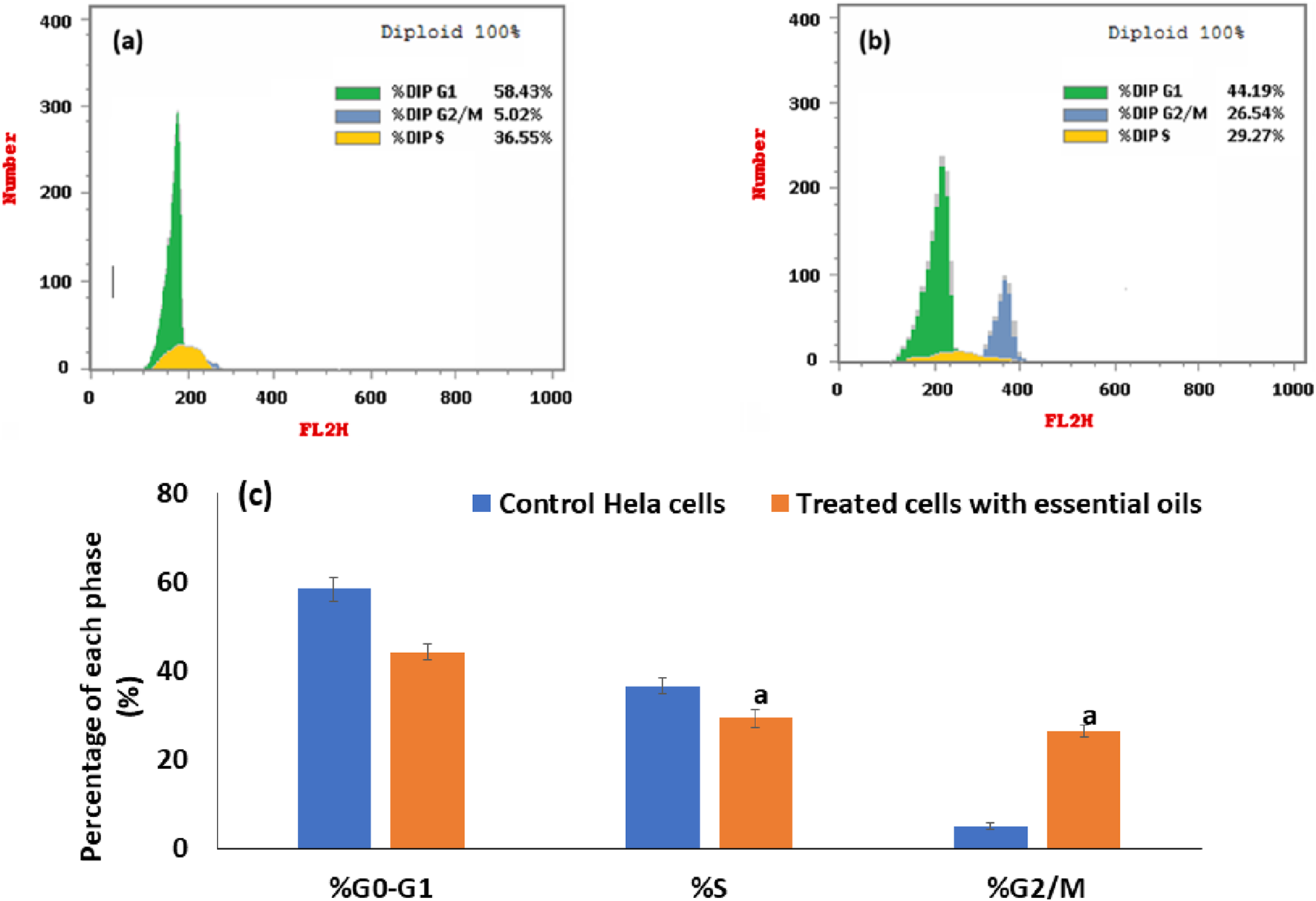Cell cycle analysis was examined to identify the cell division phases. The percentage of treated cells with the extracted essential oil and untreated cells through different stages of the cell cycle was evaluated using Abcan, a propidium iodide cytometry kit (catalog ab139418), and a flow cytometry kit, as mentioned earlier (Hanna et al., 2023). Briefly, in the 6-well culture plate, the HeLa cancer cells were harvested, and then the plate was left for 24 h, where the adhesion of cells occurred. Then the cells were incubated with the extracted essential oil for 48 h. After that, the cells were collected, trypsinized with trypsin EDTA, harvested using centrifugation at 1,500 rpm for 5 min, and finally fixed with 70% cold ethanol overnight. After the fixation process, the cells were centrifuged, washed with PBS twice, treated with RNase (100 mM/ml), added to a fluorescent propidium iodide solution, and left in the dark at 37 °C for 30 min, that is, for staining of the treated and untreated cells. In the last step, flow cytometry was used to measure the percentage of existing cells in each phase of the cell cycle (sub-G1, G0/G1, S, and G2/M phases) to quantify the DNA content.