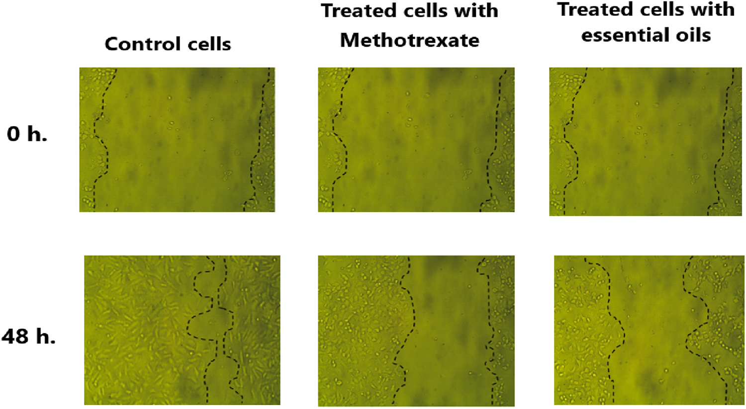 Malignant tumors proliferate uncontrollably and can spread throughout the whole body by migrating through the circulatory system. So, a wound healing assay was used to detect how the extracted essential oil can affect the ability of cervical cancer cells (HeLa) to migrate (Hanna et al., 2023). In brief, cells were incubated in a 6-well plate at 37 °C until they confluenced as a monolayer (90%). Then an artificial straight scratch was made by using a pipette tip, simulating a wound at 0 h. The formed scratch was imaged by using a light microscope and then washed with phosphate buffer saline three times. The scratched cells were seeded in fresh media containing the essential oil extracted from C. papaya seeds; untreated cells (negative control) were seeded in media containing sterile saline, while the positive control cells were cultured in fresh media containing methotrexate, then they were all incubated for 48 h at an incubation temperature of 37 °C at 5% CO2. After the incubation period (48 h), the migration of the negative control, treated cells, and positive control was imaged once more. Finally, the migration rate and the % of wound closure were calculated based on the width of cells scratched at 0 h and 48 h using the following Equations 6, 7, respectively.