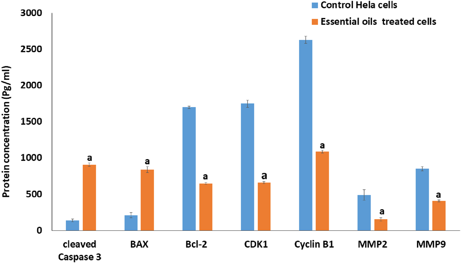 The expression levels of the proteins involved in apoptosis (Bax, Bcl-2, and Cleaved Caspase-3), cell cycle regulation (Cyclin B1 and CDK1), and metastasis (MMP-9 and MMP-2) in the extracted essential oil-treated and untreated HeLa cells were evaluated and quantified using the ELISA technique. ELISA kits used included Bax (ab199080), Bcl-2 (ab272102), Cleaved Caspase-3 (ab220655), MMP-9 (ab246539), and MMP-2 (ab267813), all provided by Abcam (Cambridge, United Kingdom). These kits employed a sensitive 90-min sandwich ELISA technique with capturing antibodies attached to an affinity tag identified by an anti-tag antibody precoated on the ELISA plates. Treated and untreated HeLa cells were centrifuged, where the pellets were discarded, and the supernatants were used as samples. Equal volumes of the supernatant and an antibody cocktail mixture (containing detector antibodies and capture antibody diluted in Antibody Diluent 5BI) were dispensed into a 96-well ELISA plate and incubated for 1 h at room temperature. After multiple washes with (1X) washing buffer, the substrate solution tetramethylbenzidine (TMB) was added to each well (10 min), and the plate was kept in the dark. Finally, a stop solution was added after that, and the absorbance was measured using an automatic microplate reader at 450 nm. Additionally, the mitosis-regulating protein expression levels were detected using the ELISA Cyclin-Dependent Kinase 1 (CDK1) Kit (Catalog No: MBS458278; MyBioSource, United States) and ELISA Cyclin-B1 Kit (Catalog No: MBS765913; MyBioSource, United States). These kits were based on the sandwich ELISA double-antibody technique, with anti-human CDK1 and anti-human Cyclin-B1 precoated on 96-well plates. Test samples, standards, and biotin-conjugated detection antibodies were added to the wells and then washed using a washing buffer. After that, the wells were treated with HRP (horseradish peroxidase-streptavidin) and TMB substrate, which induced the blue color to turn yellow by adding an acidic stop solution. The yellow color absorbance was measured using an automated microplate reader at 450 nm, which directly correlated with the amount of human CDK1 and Cyclin-B1 in the treated samples, computed using a standard curve.