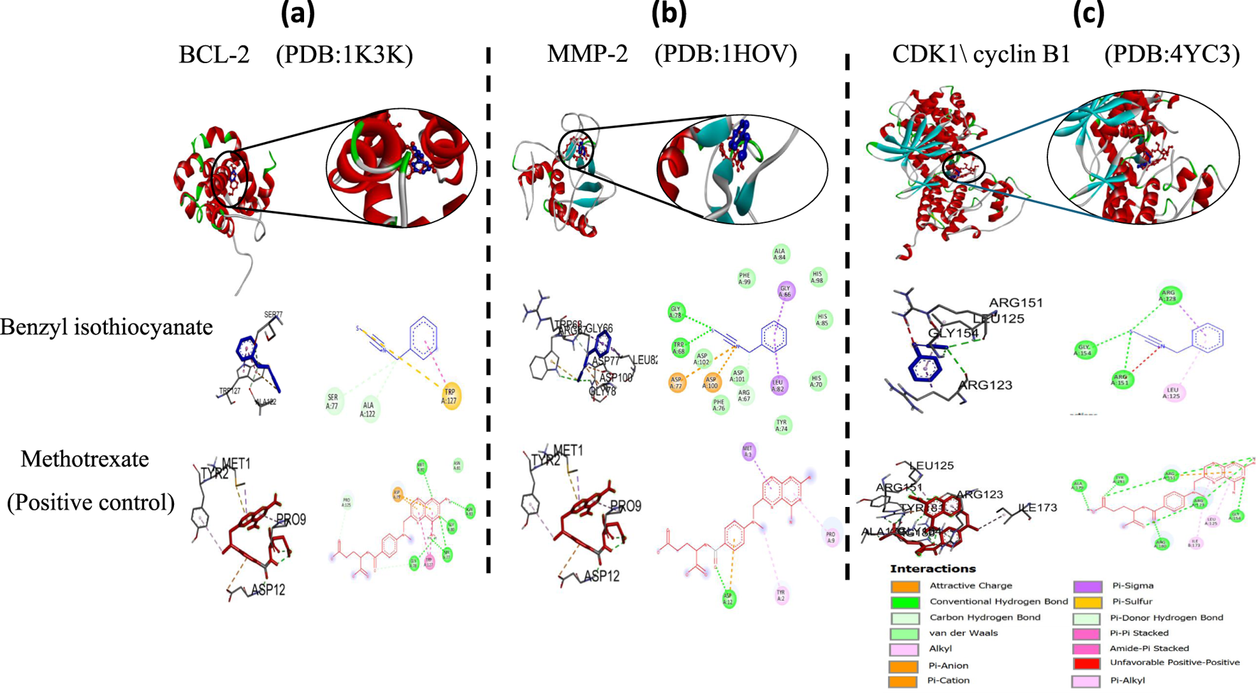 The structure of benzyl isothiocyanate, as well as the positive control, methotrexate (MTX), was downloaded as an SDF file from the PubChem database (https://pubchem.ncbi.nlm.nih.gov/). Then, converted SDF files to PDB format by using the free software Avogadro (https://avogadro.cc/). The PDB file for BCL-2 crystal structures (PDB ID: 1K3K) is a key player for pro- or anti-apoptotic activities, the PDB file for MMP-2 crystal structures (PDB ID: 1HOV) is a key player in the tumor ecosystem, and the PDB file for CDK1/cyclin B1 crystal structures (PDB ID: 4YC3) is a key player for arrest in G2/M. They were downloaded from the Protein Data Bank (http://www.rcsb.org/pdb/). These targets were selected based on their biological relevance: BCL-2 as a regulator of apoptosis, MMP-2 as a modulator of the tumor microenvironment, and CDK1/Cyclin B1 as a checkpoint controller of the G2/M cell cycle arrest, supported by prior literature (Petros et al., 2001; Quick et al., 2014; Brown et al., 2015; Hobani et al., 2017). As co-crystallized ligands were not available for 1K3K and 1HOV structures, blind docking was initially performed to identify potential binding regions. The convergence of benzyl isothiocyanate poses across multiple runs informed the prediction of the active site, which was Docking box dimensions were defined around this predicted site to ensure accurate redocking and pose evaluation. The box dimensions for 1K3K are 230.7 mm, 32.8 mm, and 116.9 mm for X, Y, and Z, respectively, while the box dimensions for 1HOV are 17.1 mm, 26.6 mm, and 19.7 mm for X, Y, and Z, respectively. The CDK1–Cyclin B1 complex (PDB ID: 4YC3) contains a co-crystallized ligand, enabling structural validation of the binding pocket. The active site was further predicted using Proteins Plus (https://proteins.plus), integrating geometric and chemical criteria to refine docking box dimensions and ensure accurate ligand placement. The box dimensions are 22.924, 5.297, and 168.970. Validation procedures included pose clustering analysis based on RMSD similarity and binding energy ranking. These metrics were used to assess conformational consistency and identify the most stable ligand orientations.