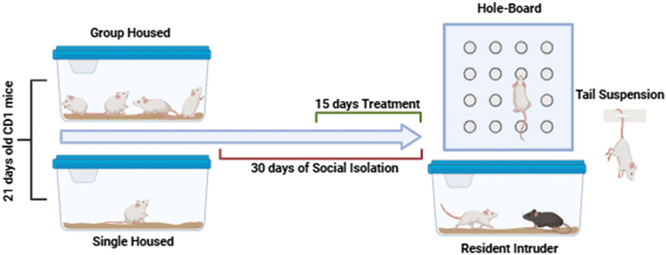 Male CD1 mice (Inotiv, Italy), weighing 16–18 g at study initiation, were used in this experiment. Animals were housed either individually (social isolation group) or in groups of 3-4 per cage (group-housed controls) under standardized laboratory conditions: 12-h light/dark cycle (lights on at 06:00), ambient temperature maintained at 20 °C–22 °C, and relative humidity of 55%–60%. All animals had ad libitum access to standard chow and tap water. Following a minimum 7-day acclimatization period, experimental procedures commenced. All experimental protocols were approved by the Animal Ethics Committee of the University of Campania “Luigi Vanvitelli”, Naples (Project Approval No. 24/2023-PR), in compliance with Italian (D.L. 116/92) and European (E.C. Directive 86/609/EEC) regulations for laboratory animal welfare. We implemented all necessary measures to minimize animal discomfort and optimize the experimental design to reduce the number of animals required. The health status of all animals was monitored throughout the entire study period to ensure both animal welfare and data integrity. This was performed through daily visual inspections by the research team and regular, formal health checks conducted by the institutional veterinary staff of the animal facility. Throughout the duration of the experiment, no signs of illness, distress, or other health-related complications were observed in any of the experimental groups.
