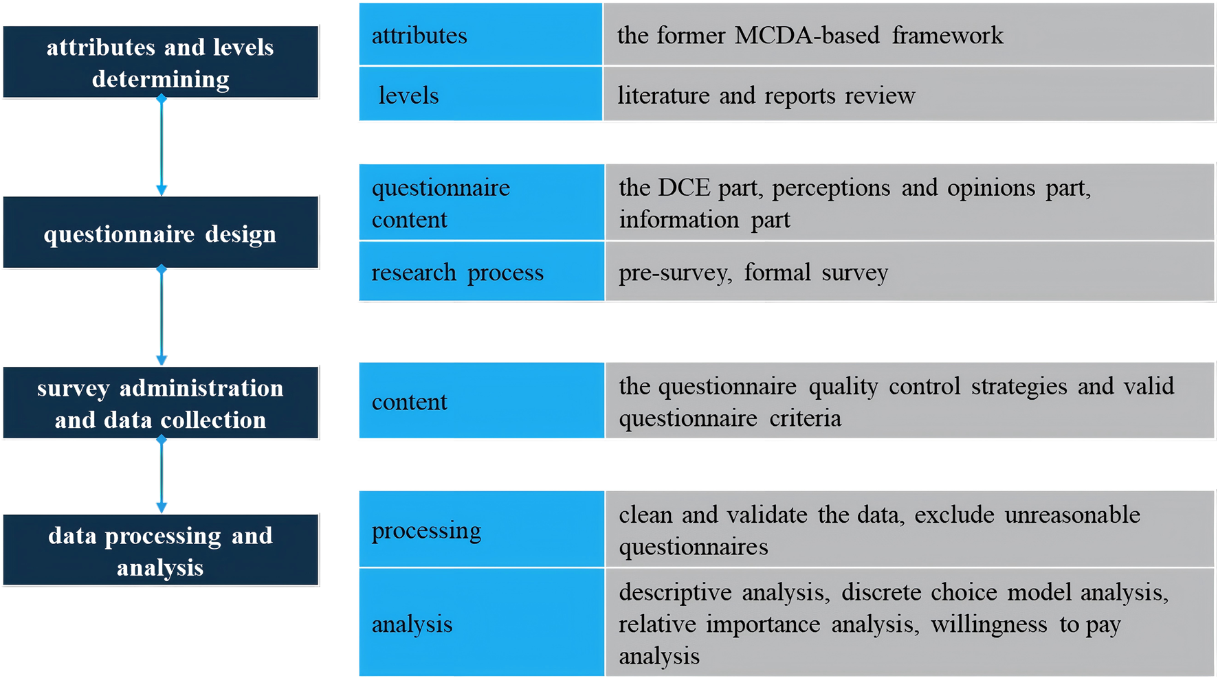 In 2011, the International Society for Pharmacoeconomics and Outcomes Research (ISPOR) developed a detailed checklist to assess the completeness and rigor of DCE studies (Bridges et al., 2011), and provided detailed guidance on experimental designs (Reed Johnson et al., 2013), data analysis methods (Hauber et al., 2016), and the accounting for preference heterogeneity (Vass et al., 2022) in DCE implementation. Following these checklist, our study was structured into four key steps: 1)attributes and levels determining, 2)experimental design, 3) survey administration and data collection, 4)statistical analyses. The flowchart of the study is shown in Figure 1.
