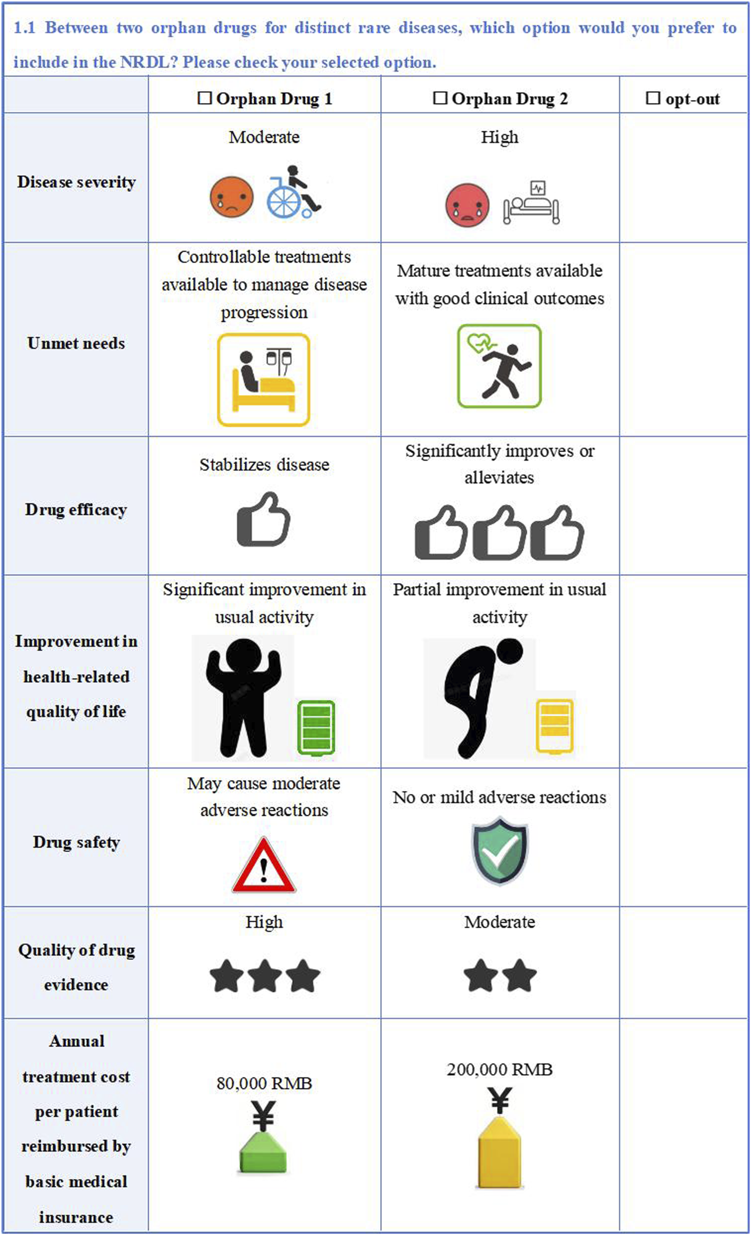 The study employed an unlabeled design for the DCE with alternatives generically labeled ‘Orphan Drug 1’ and ‘Orphan Drug 2’ to avoid comparative superiority between different orphan drug alternatives and focus participant evaluation on the specific drug value attributes. To better align with real-world selection situations, an ‘opt-out option’ was added to each choice set. For quality control, we added a set of repeated choice sets to each questionnaire as a basis for consistency validation to ensure the internal consistency. Hence, each respondent was required to complete 11 DCE choices. An example of DCE questionnaire is shown in Figure 2.