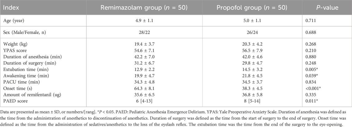 Preoperative anxiety scales were assessed using the Yale preoperative anxiety scale (YPAS) (Kain et al., 1995). The onset time, extubation time and awakening time were recorded. Systolic blood pressure (SBP), diastolic blood pressure (DBP) and heart rate (HR) were measured before anesthesia (T0), immediately before intubation (T1), 3 min after intubation (T2), 15 min after the start of surgery (T3), and at the end of surgery (T4). Drug-related complications, including hypotension, bradycardia, injection site pain, respiratory depression, emergence agitation, nausea and vomiting, were recorded. Emergence agitation was assessed using the Pediatric Anesthesia Emergence Delirium (PAED) scale. The PAED scale evaluates emergence agitation using five items: 1) Eye contact with the caregiver, 2) Purposeful actions, 3) Awareness of surroundings, 4) Restlessness, and 5) Inability to calm down. It employs a five-point Likert scale (0 = Extremely; 1 = Very much; 2 = Quite a bit; 3 = Just a little; 4 = Not at all) for quantifying emergence agitation, with dimensions four and five utilizing a reverse scoring system. Emergence agitation was defined as a PAED score of ≥12 (He et al., 2023).