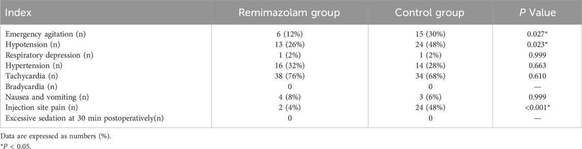 Adverse events of children are showed in Table 2. The incidence of emergence agitation, hypotension and injection site pain significantly decreased in the Remimazolam group (12% vs. 30%, P = 0.027; 26% vs. 48%, P = 0.023; 4% vs. 48%, P < 0.001, respectively). However, there was no statistically significant difference in the incidence of complications such as bradycardia, tachycardia, hypertension respiratory depression, excessive sedation, nausea and vomiting between the two groups.