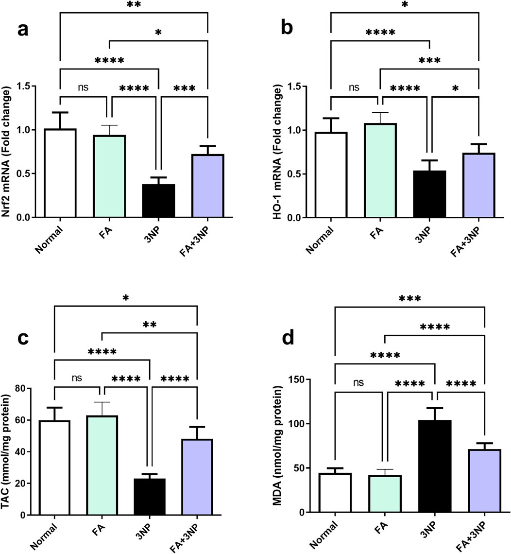 Figure 4. FA intake impacts on striatal (a) Nrf2 and (b) HO-1 mRNA expression, as well as (c) TAC and (d) MDA content in rats subjected to 3NP. Data are presented as mean ± SD; ns (non-significant, P > 0.05), *P < 0.05, **P < 0.01, ***P < 0.001, and ****P < 0.0001.