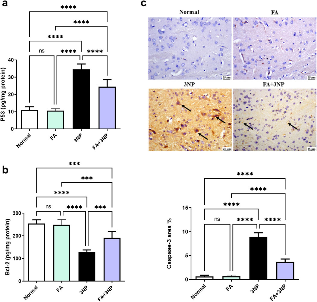 Figure 7. FA intake impacts on striatal (a) p53, (b) Bcl-2 content, and (c) caspase-3 IHC in rats subjected to 3NP. Data are presented as mean ± SD; ns (non-significant, P > 0.05), *P < 0.05, **P < 0.01, ***P < 0.001, and ****P < 0.0001.