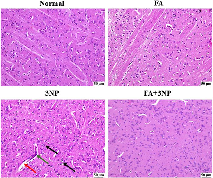 Figure 9. Representative photomicrographs of H & E stained stratia in the normal and FA groups showing intact neurons with normal histological architecture. 3NP group, showing gliosis (black arrow), distinct capillaries (green arrow), and edema (red arrow). FA+3NP group, showing apparently normal striatum.
