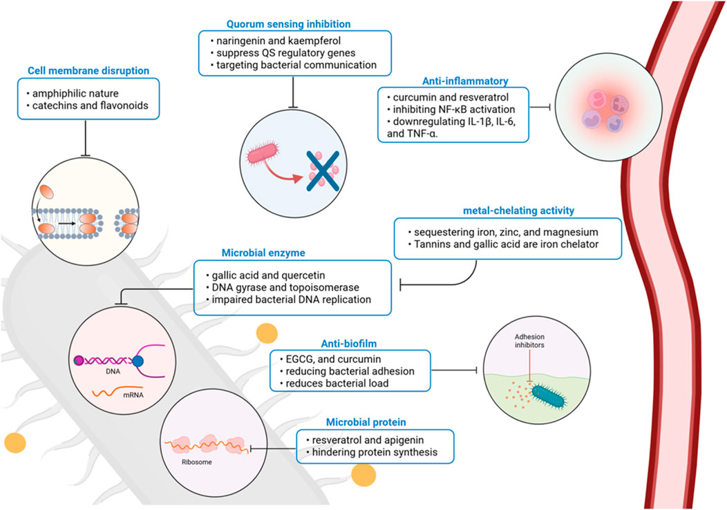 In established biofilms, polyphenols may penetrate through the extracellular polymeric substance (EPS) matrix and destabilize the architecture (Fontana et al., 2022). The EPS, composed primarily of polysaccharides, proteins, lipids, and extracellular DNA, is a scaffold that shields bacteria from host immune response as well as antimicrobials. Polyphenols such as curcumin and tannic acid disrupt EPS integrity by chelating metal ions (e.g., calcium and magnesium) that support the biofilm matrix, break down matrix constituents, or induce oxidative stress inhibiting matrix synthesis. Disruption undermines biofilm structure, puts bacteria in contact with environmental insults, and enhances the efficacy of adjunctive therapies (Pinto et al., 2020).
