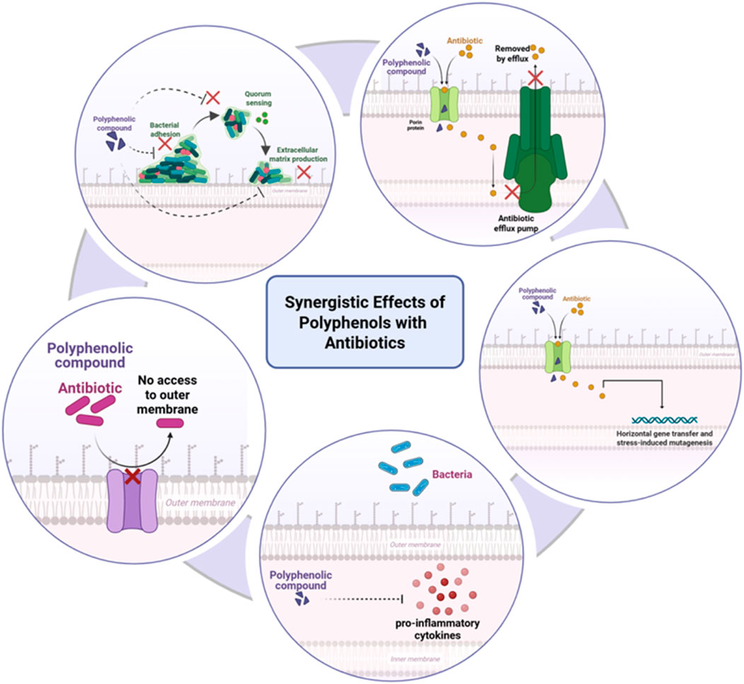 Pharmacologically, these synergistic interactions are avenues for dose-sparing strategies with lowered risks of long-term antibiotic use, such as gastrointestinal dysbiosis and allergic reactions (Kesavelu and Jog, 2023). Moreover, synergy between polyphenols and antibiotics may prolong the useful life of existing antimicrobial compounds while lowering the demand for developing entirely new drugs (De Rossi et al., 2025).