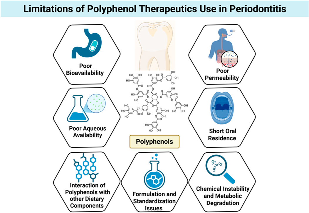 While polyphenols have tremendous potential for the treatment of periodontal disease, their current clinical usefulness is hindered by several pharmacokinetic and formulation-related drawbacks. Overcoming constraints related to solubility, stability, mucosal retention, and targeted delivery remains important in the pursuit of polyphenol-based therapeutics. Advances in formulation science and delivery technology will be critical to the full exploitation of these naturally occurring compounds for therapeutic advantage in periodontal as well as general oral healthcare (Stromsnes et al., 2021; Ezike et al., 2023).