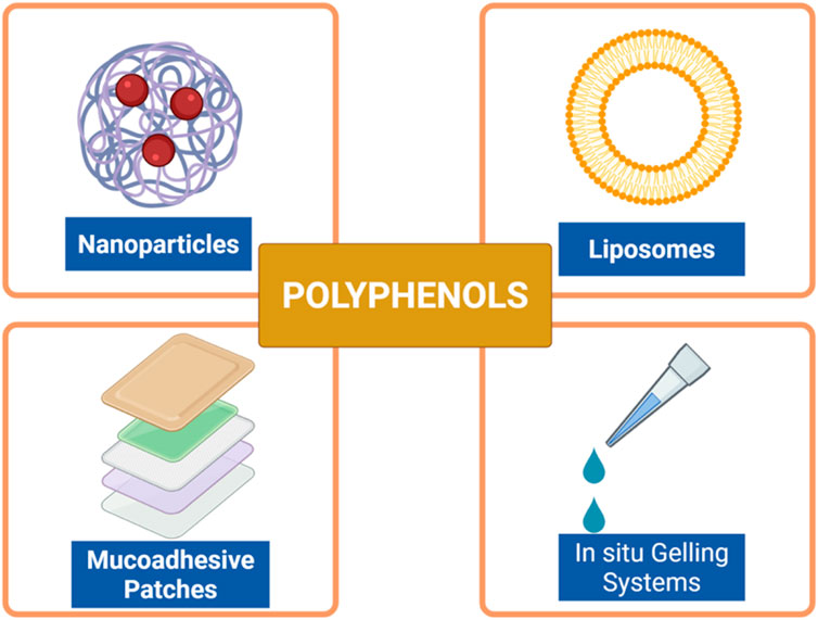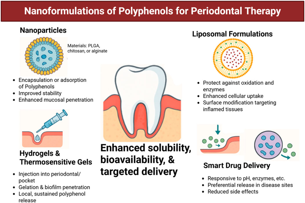 To surmount these challenges, research has increasingly been conducted on the application of new drug delivery systems, including nanoparticles, liposomes, mucoadhesive patches, and in situ gelling systems. These systems aim to stabilize the polyphenols against degradation, increase their solubility, facilitate tissue penetration, and provide controlled release. These technologies are, however, also connected with limitations such as complexity in fabrication, potential toxicity of the carrier, stability during storage, and scalability for clinical use (Ezike et al., 2023).