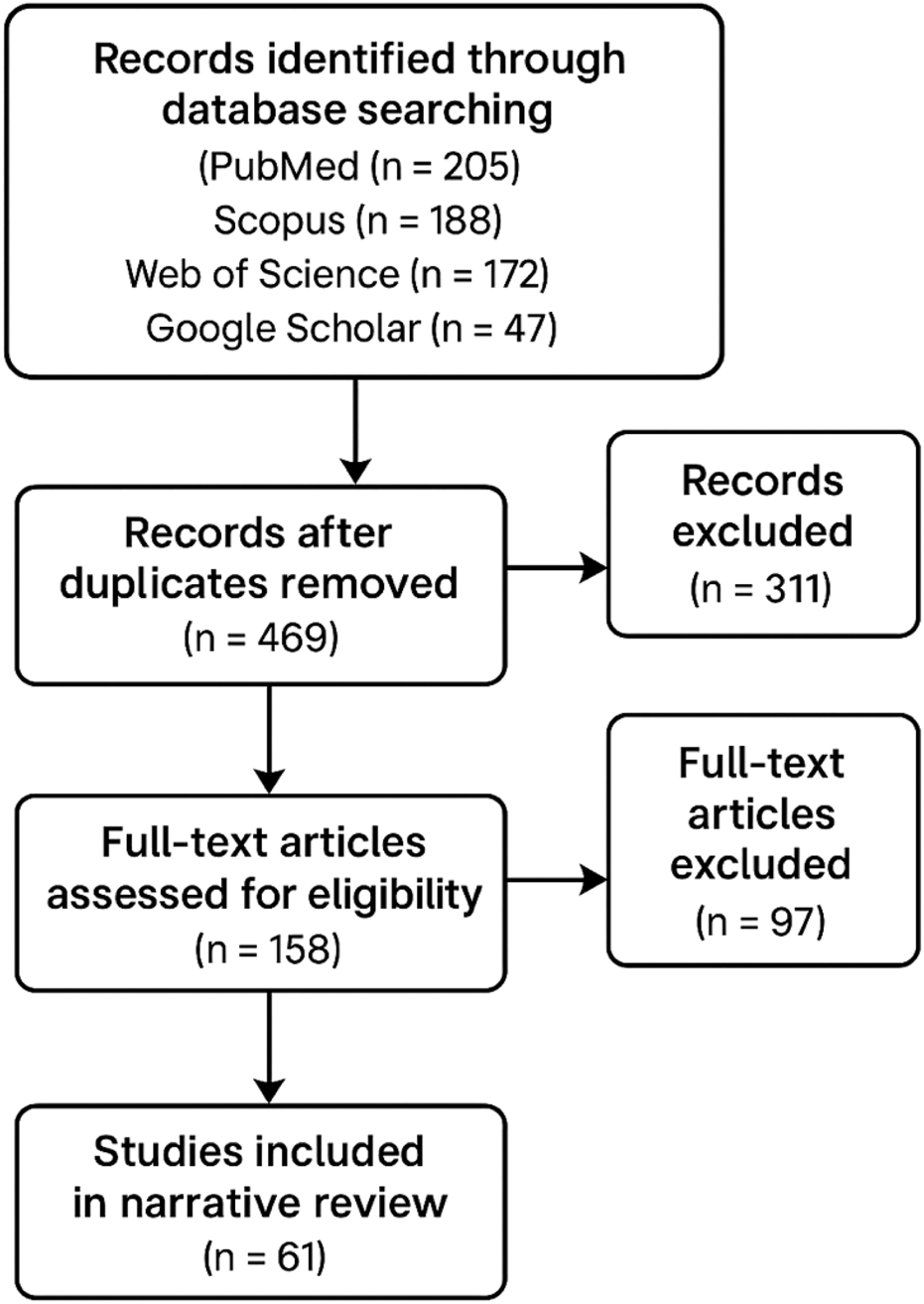 A total of 612 records were identified through database searching (PubMed = 205, Scopus = 188, Web of Science = 172, Google Scholar = 47). After removal of duplicates (n = 143), 469 articles remained for screening. Following title and abstract screening, 311 articles were excluded as irrelevant. The full text of 158 articles was examined, and 97 were excluded due to insufficient mechanistic focus, lack of relevance to multidrug-resistant strains, or non-English language. In total, 61 studies were included in this review (Figure 1).