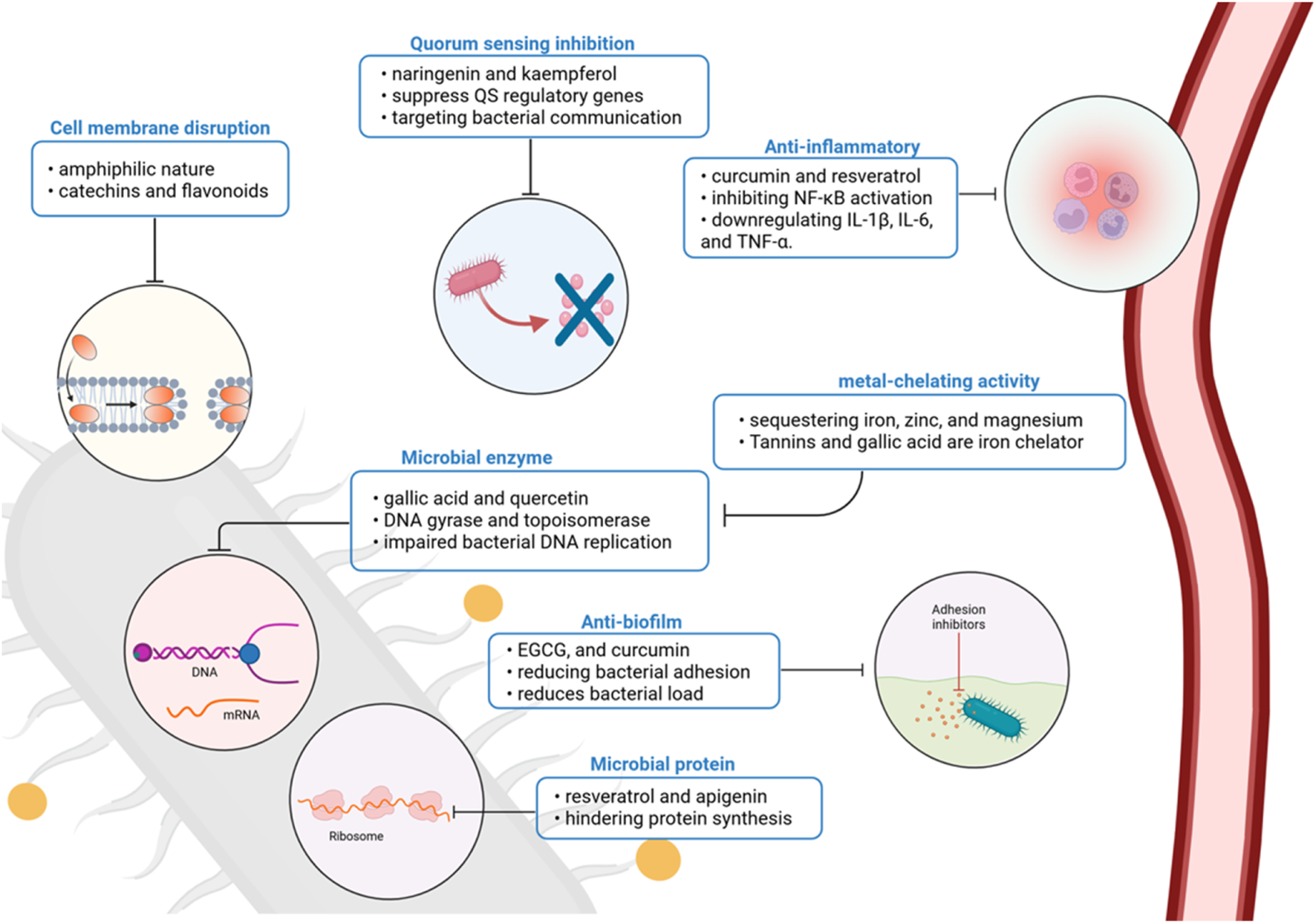 Polyphenolic compounds act through multiple antimicrobial and host-modulatory mechanisms in periodontal disease. Their effects include membrane disruption, enzyme and protein synthesis inhibition, biofilm and quorum-sensing interference, metal chelation, and suppression of pro-inflammatory signaling. Together, these actions reduce bacterial virulence and support host immune modulation, positioning polyphenols as promising adjuncts in periodontal therapy. Created with Biorender.com.