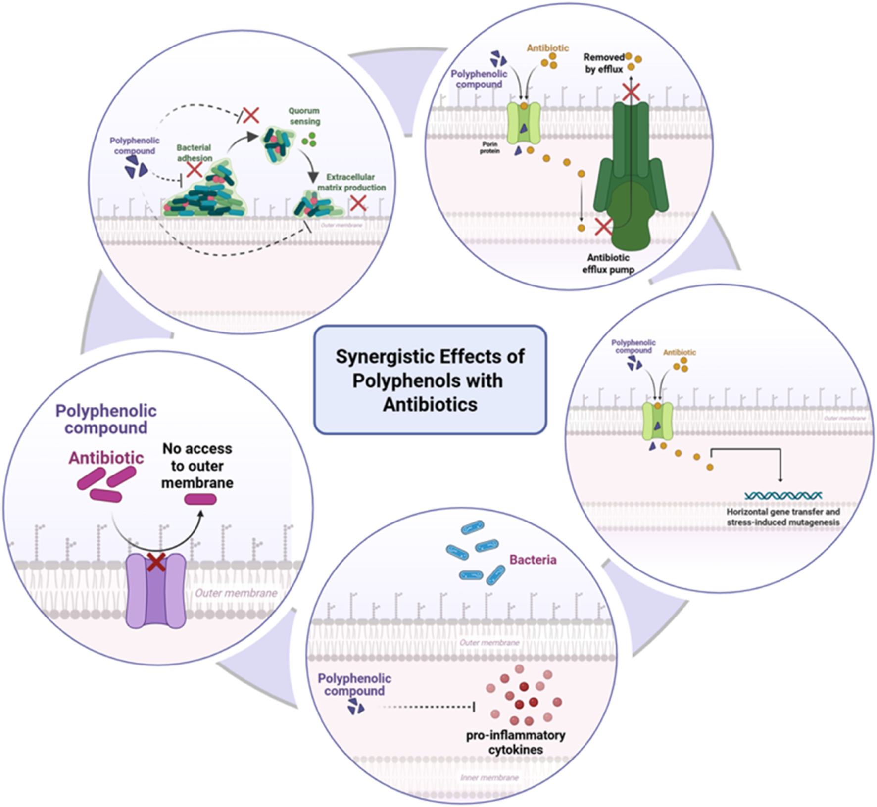 Synergistic effects of polyphenols with antibiotics against multidrug-resistant periodontal pathogens. Polyphenols enhance antibiotic action by disrupting bacterial membranes, inhibiting efflux pumps, interfering with quorum-sensing systems, and suppressing virulence gene expression. They also modulate host inflammatory pathways, reducing pro-inflammatory cytokine release and supporting immune defense. Together, these combined effects potentiate antibiotic efficacy while mitigating resistance. Created with Biorender.com.