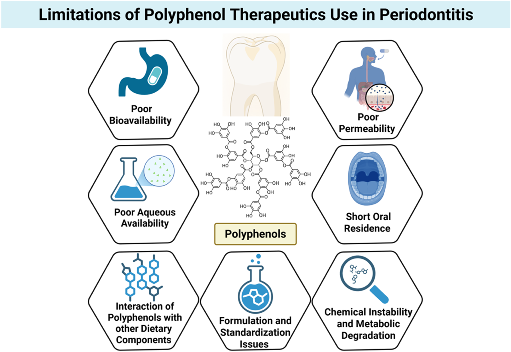 Limitations of polyphenol use in periodontal therapeutics. Despite their promising antimicrobial and host-modulatory effects, polyphenols face several barriers to clinical application, including poor bioavailability, low aqueous solubility, limited permeability, short oral residence time, and susceptibility to chemical instability and metabolic degradation. Additional challenges include interactions with dietary components and inconsistencies in formulation and standardization, all of which hinder translation into effective periodontal therapies. Created with Biorender.com.