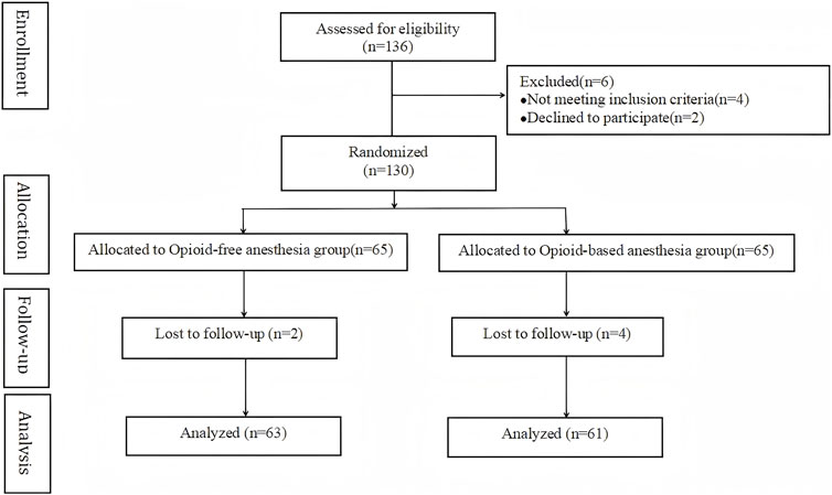 The sample size was determined based on the QoR-40 data reported by Myles et al., which indicated a minimal clinically important difference (MCID) of 6.3 (SD = 14) (Myles et al., 2016). Using a two-sided α = 0.05 and β = 0.1, a total of 52 participants were required per group by relevant calculation formula. Considering a 15% dropout rate, the target sample size was set at 122, with 61 participants per group. In this study, 130 patients were initially enrolled; however, due to the impact of pandemic control measures, follow-up data were unavailable for 6 subjects. Consequently, data from 124 participants were included in the final analysis.