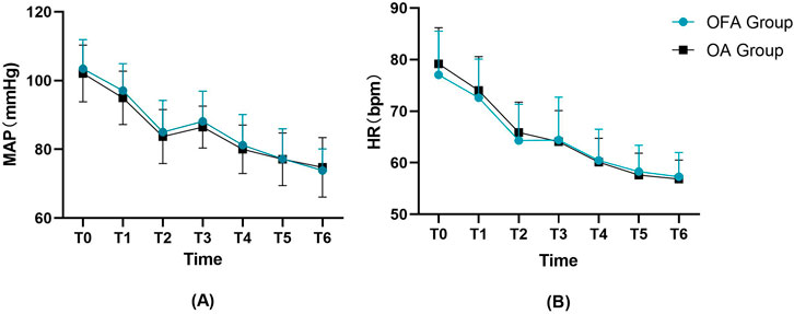 Figure 3. Perioperative hemodynamic variables including (A) MAP, (B) HR at seven time points. HR, heart rate; MBP, mean blood pressure. T0,upon entering the operating room. T1,before anesthesia induction. T2,before tracheal intubation. T3,immediately after tracheal intubation. T4,at skin incision. T5,10 min after skin incision. T6, upon leaving the operating room.