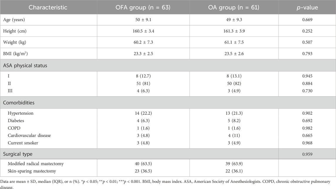 The detailed enrollment and exclusion flowchart are shown in Figure 2. From May 2022 to May 2023, a total of 136 patients who underwent radical mastectomy for breast cancer at Xuzhou Central Hospital were enrolled in this study. Four failed inclusion criteria, and two declined participation. Hence, 130 patients underwent randomization. Six were excluded due to pandemic-related follow-up issues. Finally, 124 patients (63 OFA, 61 OA) completed the study.