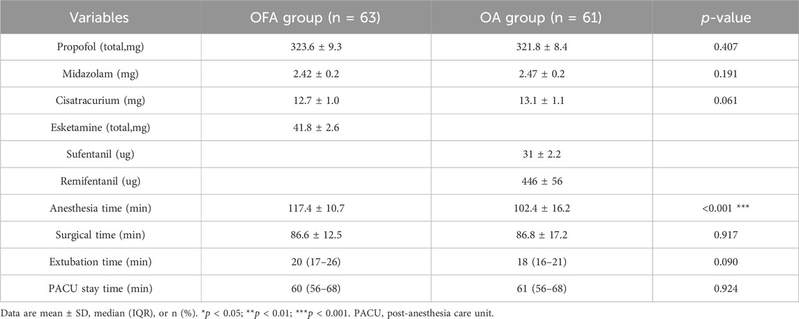 The total consumption of propofol, midazolam, and cisatracurium during operation showed no statistically significant differences between the two groups (all p > 0.05). There were no statistically significant differences between the two groups regarding duration of surgery, time to extubation, length of stay in PACU. However, a significant difference was noted in anesthesia duration between the OFA group and the OA group (p < 0.001, Table 2).