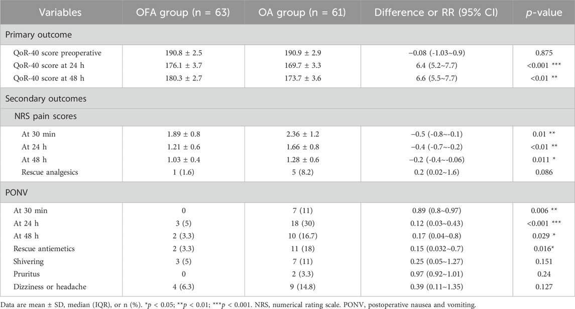 All patients successfully completed the Quality of Recovery-40 (QoR-40) questionnaire. The total QoR-40 score ranges from 40 (poorest recovery) to 200 (optimal recovery), with 6.3 considered the MCID. No significant difference was found in the baseline QoR-40 scores between the two groups (OFA group: 190.8 ± 2.5vs.OA group: 190.9 ± 2.9; mean difference: −0.08, 95% CI [-1.03, 0.9]; p = 0.875). However, the primary outcome of this study, the QoR-40 score at 24 h postoperatively, was significantly higher in the OFA group than in the OA group (OFA group 176.1 ± 3.7vs.OA group 169.7 ± 3.3; mean difference 6.4, 95% CI [5.2, 7.7], p < 0.001, Table 3). A similar advantage was observed in the QoR-40 score at 48 h postoperatively (OFA group 180.3 ± 2.7vs.OA group 173.7 ± 3.6; mean difference 6.6, 95% CI [5.5, 7.7], p < 0.01).