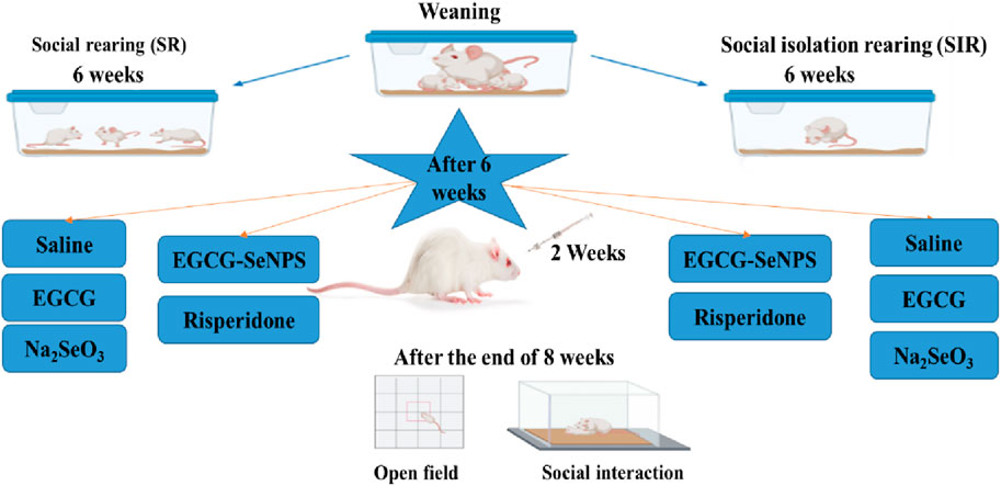 Methods: Male rats (21–23 days old) were divided into two groups: the social rearing (SR) group and the social isolation-reared (SIR) group (one rat per cage). The experiment lasted for eight weeks. For the last 2 weeks, rats in both SR and SIR were assigned to saline, EGCG (50 mg/kg), sodium selenite (0.5 mg/kg), EGCG-SeNPs (0.5 mg/kg), and risperidone (2.5 mg/kg) treated groups. At the end of the experiment, all rats were subjected to behavioral tests, and the prefrontal cortex tissues from each group were analyzed for oxidative stress parameters, proinflammatory cytokines, neurochemicals, apoptotic markers, and histopa-thological changes.