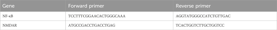 RNA was extracted from the prefrontal cortex using the TRIzol method. Using a Cellixi-cDNA synthesis kit, the first-stranded cDNA was formed. The three technical replicates were subsequently amplified with Power SYBR Green and assessed using the Applied Biosystems (7500) device. PCR was performed under the following conditions: one cycle at 95 °C for 10 min, followed by 40 cycles at 95 °C for 15 s, annealing at 57 °C for NF-κB and 60 °C for NMDAR for approximately 30 s, and a final extension at 72 °C for 30 s. Following amplification, each sample’s cycle counts at the linear amplification threshold (Ct) for the reference gene GAPDH were calculated. The comparative Ct method was then used to calculate relative gene expression (Pfaffl, 2001). NF-κB and NMDAR mRNA expressions were estimated. The primer sequences used for RT-PCR are presented in Table1.