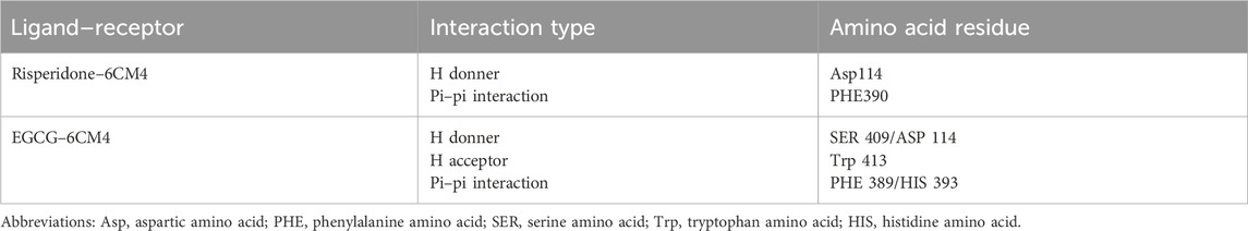 The main target of both typical and atypical antipsychotic medications is the D2 dopamine receptor (DRD2) (Wang et al., 2018). The effect of EGCG on D2 dopamine receptors was studied. The maestro of Schrödinger’s Glide’s Standard Precision software was used to conduct the docking test. The DRD2–risperidone and DRD2–EGCG structures indicate the structural basis for the effects of risperidone and EGCG at DRD2. The protein 3D structure was obtained from the Protein Data Bank (6cm4) Structure of the D2 dopamine receptor bound to the atypical antipsychotic drug risperidone.