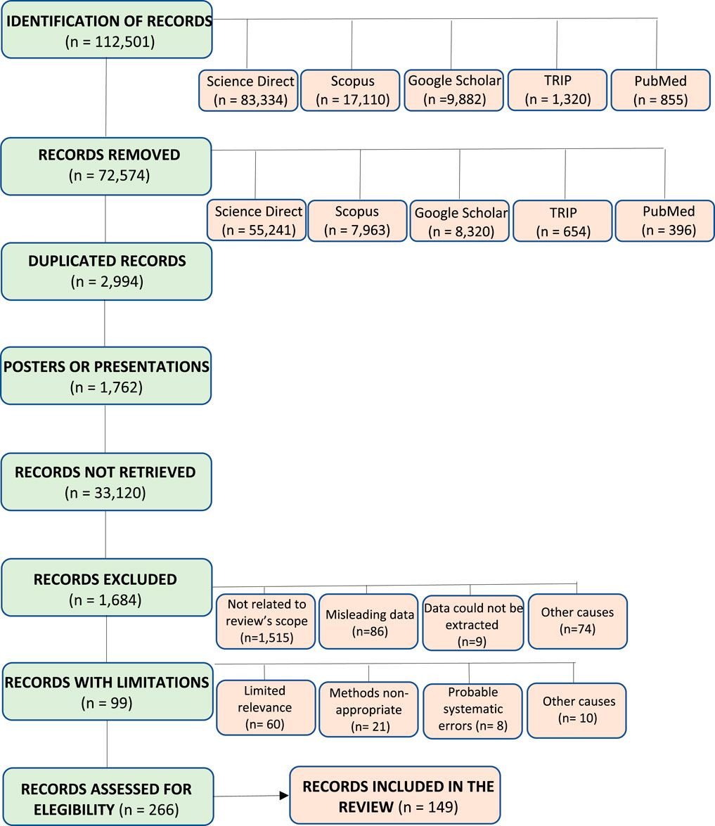 Flowchart visualizing the identification and selection of records for a review. Starting with 112,501 records, sources include Science Direct, Scopus, Google Scholar, TRIP, and PubMed. Records removed total 72,574, with 2,994 identified as duplicates. Posters or presentations account for 1,762 records, and 33,120 were not retrieved. 1,684 records were excluded for various reasons, including irrelevance and misleading data. Records with limitations numbered 99. Ultimately, 266 records were assessed for eligibility, with 149 included in the review.