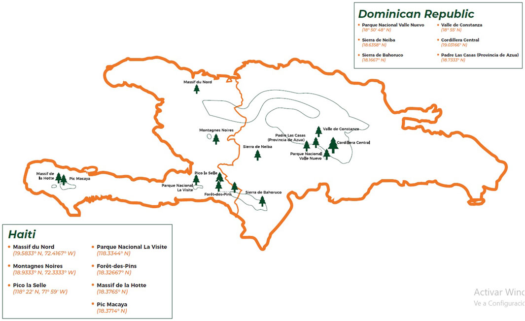 Figure 2. The distribution range of Pinus occidentalis Swartz in Hispaniola (Source: Instituto de Innovación en Biotecnología e Industria -IIBI-, Santo Domingo, Dominican Republic).