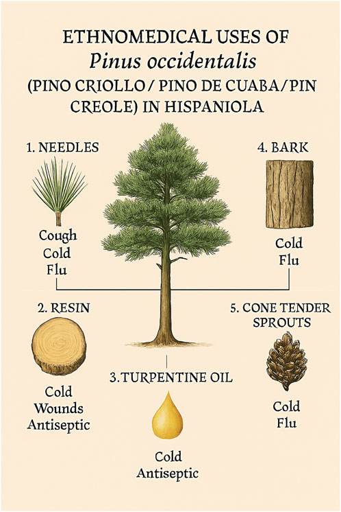 Ethnomedical uses of Pinus occidentalis in Hispaniola are illustrated. The tree and its parts—needles, resin, turpentine oil, bark, and cone tender sprouts—are used for various ailments. Needles treat coughs, colds, and flu. Resin and turpentine oil are used for colds, wounds, and as antiseptics. The bark and tender sprouts help with colds and flu.