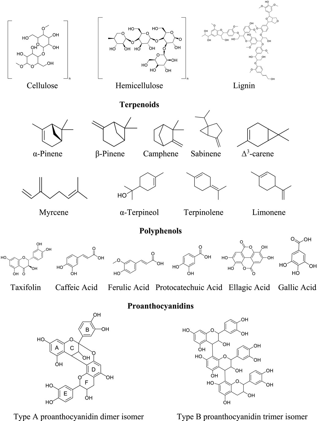 Chemical structures of various compounds are categorized into four groups. Cellulose, hemicellulose, and lignin are shown first. Next, terpenoids are displayed: alpha-pinene, beta-pinene, camphene, sabinene, delta-three-carene, myrcene, alpha-terpineol, terpinolene, and limonene. Polyphenols follow, including taxifolin, caffeic acid, ferulic acid, protocatechuic acid, ellagic acid, and gallic acid. Lastly, proanthocyanidins are shown with Type A proanthocyanidin dimer isomer and Type B proanthocyanidin trimer isomer.