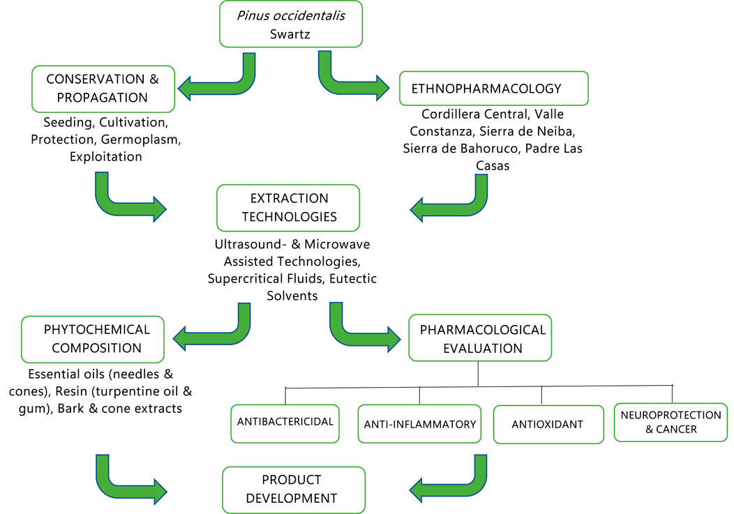 Flowchart detailing the processes and components related to *Pinus occidentalis* Swartz. Key areas include conservation, ethnopharmacology, extraction technologies, phytochemical composition, pharmacological evaluation, and product development, with specific functions and locations noted.