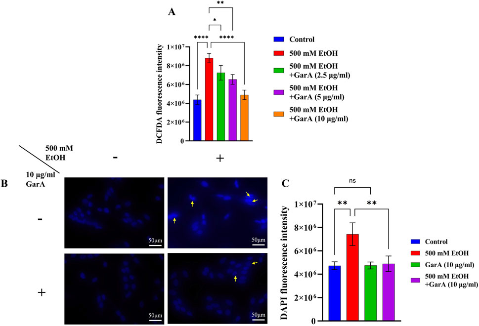 Figure 2. (A) DCFDA fluorescence intensity in presence of ethanol (500 mM) and GarA (2.5, 5 and 10 μg/mL); (B) Photo-micrographs of SH-SY5Y cells (at ×40 magnification) in presence and absence of ethanol (500 mM) and GarA (10 μg/mL); (C) DAPI fluorescence intensity. Values are represented as Mean ± SD and significance was calculated using One-way ANOVA with Dunnet’s multiple comparisons where nsp > 0.05, *p < 0.05, **p < 0.01 and ****p < 0.0001. (n = 3) (Scale bar = 50 μm).