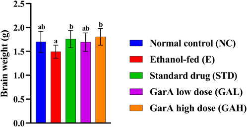 Figure 4. Weight of rodent brain collected after study completion. Values are represented as Mean ± SD and significance was calculated using One-way ANOVA with Tukey’s post hoc HSD. Different letters across the treatment groups indicate significant difference p < 0.05 (n = 6).