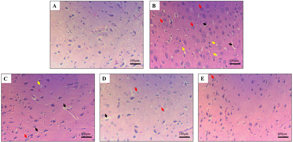 Figure 5. Haematoxylin and eosin staining in rat cerebral cortex showing (A) normal morphology in control (B) damaged neuronal morphology in ethanol-fed rodents (C) and (D) slightly improved neuronal morphology in Standard drug treated and GarA low dose (GAL), respectively (E). Improved neuronal tissue and cells in GarA high dose (GAH) treated rodents. Black arrows depict vacuolisation, yellow arrows show pericellular space around necrotic neurons and red arrows show pyknotic nuclei. Images taken at ×40 magnification and scale bar depicts 100 μm.