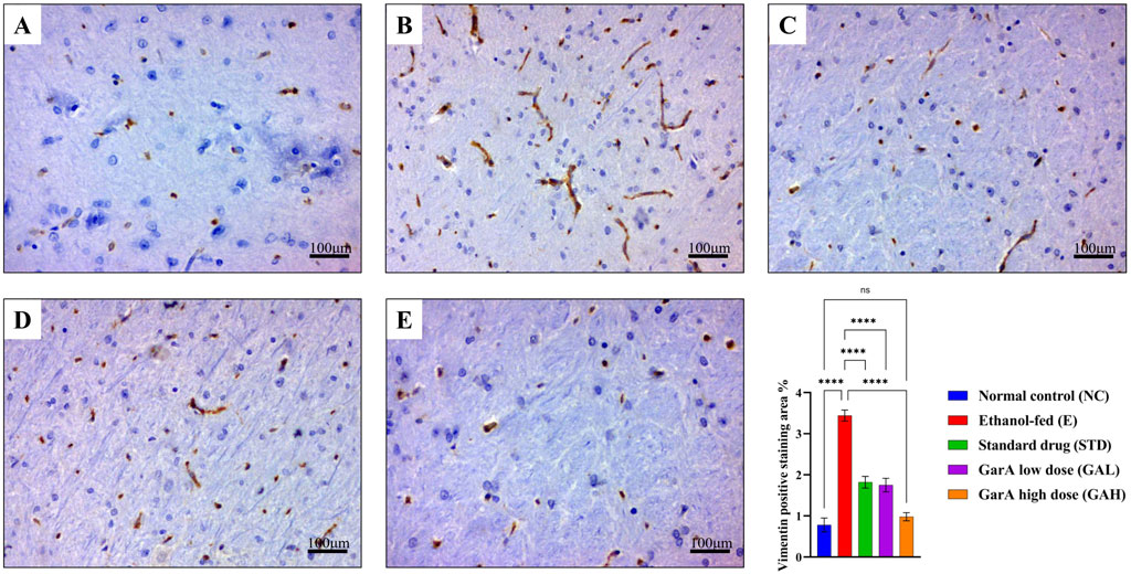 Figure 6. Vimentin immunohistochemistry for staining reactive astrocytes. Photo-micrographs of rat brain cerebral cortex at ×40 magnification stained using anti-vimentin antibody showing (A) normal in control (B) increased positive staining in ethanol-fed rats and decreased in (C) drug treated (D) low dose GarA and (E) high dose GarA treated rats (F). Graph showing vimentin positive staining area % in different groups (fields/animal). Values are represented as Mean ± SD and significance was calculated using One-way ANOVA with Tukey’s post hoc HSD where nsp > 0.05, and ****p < 0.0001 (n = 6, technical replicates).