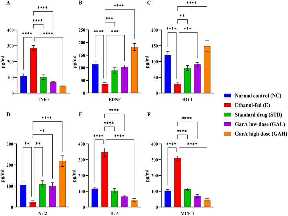Protein expression in rat brains was estimated using ELISA kits for selected protein targets. TNFα in the diseased group (E), was found to be upregulated 3-folds of the control (NC) rats. While it was observed that the expression decreased in the STD and GarA treated groups. Moreover, the expression of BDNF showed an upregulation in the case of GAH animals, as compared to the NC animals as well. BDNF was diminished in the disease (E) group. Similar trends were observed in the expression of HO-1 and Nrf2 expression profiles, further corroborating the results. Notably, it was observed that for IL-6 and MCP-1, the GAH group showed a drastic reduction in the expression, as compared to all the other groups (Figure 7).