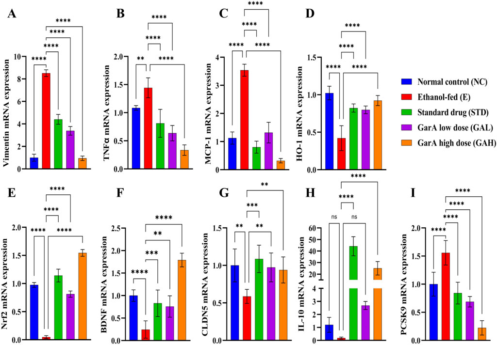 Figure 8. GarA shows neuro-protective effect in rats against alcohol induced damage. Gene expression over β-actin in vivo in different treatment groups showing (A). Vimentin (B). TNFα (C). MCP-1 (D). HO-1 (E). Nrf2 (F). BDNF (G). CLDN5 (H). IL-10 (I). PCSK9. Values are represented as Mean ± SD and significance was calculated using One-way ANOVA with Tukey’s multiple comparisons where nsp > 0.05, **p < 0.01, ***p < 0.001 and ****p < 0.0001 (n = 6).